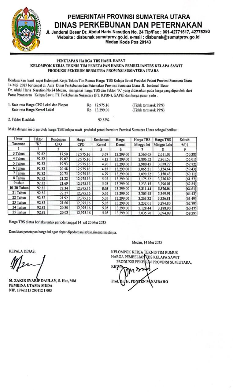 Harga TBS sawit mengalami penurunan harga untuk periode tanggal 14 s/d 20 Mei 2025.