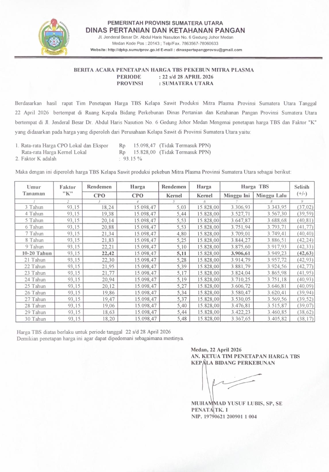 Harga TBS sawit mengalami penurunan harga untuk periode tanggal 22 s/d 28 April 2026.